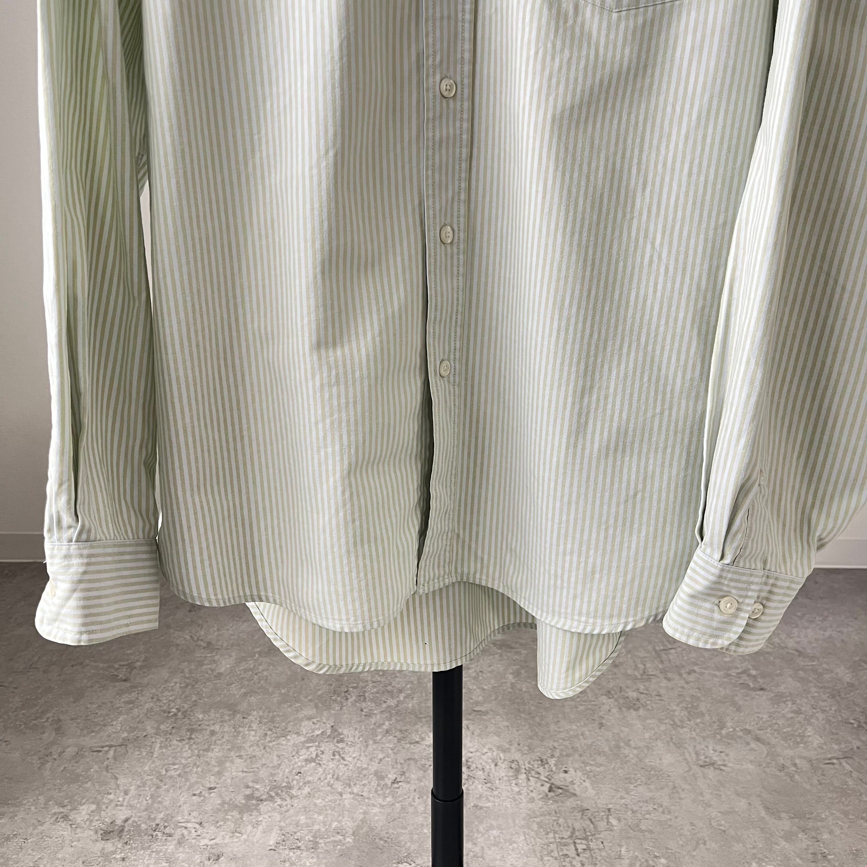 さて、シルエットですが、"あの"ラルフのビッグシャツよりも着丈が短く、よりボックスで着やすいシルエットかと思います。イエロー&グレーとホワイトの中間のお色のストライプ。